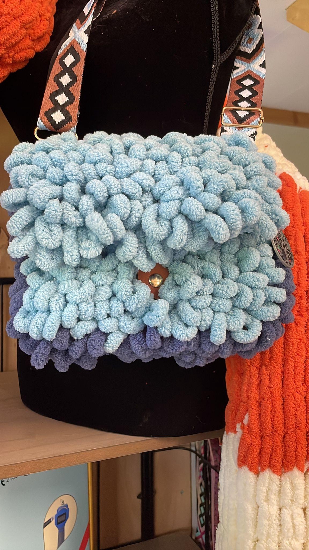 Je leert hoe je met puffy lusgaren, zonder naalden, een prachtig tasje maakt.